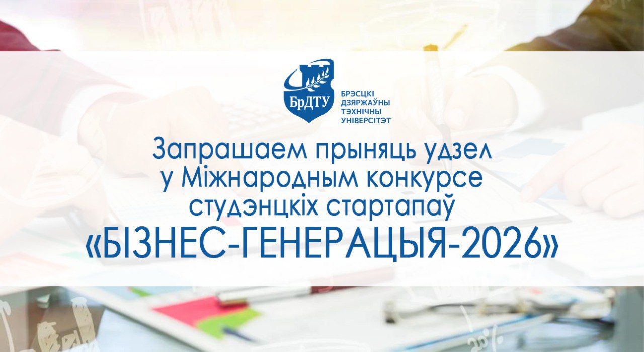 Брэсцкі дзяржаўны тэхнічны ўніверсітэт аб'яўляе старт Міжнароднага конкурсу студэнцкіх стартапаў "БІЗНЕС-ГЕНЕРАЦЫЯ-2026", які прымеркаваны да знамянальнай даты — 60-годдзя нашага ўніверсітэта!